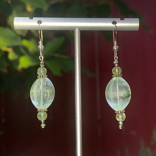 Fluorite, sterling silver, green apatite, and tiny fresh water pearl pearl drop earrings