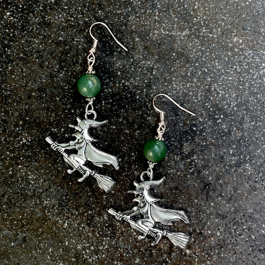 Onyx gemstone Hearts and steel Witch on broom Earrings