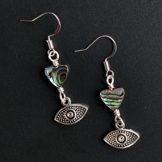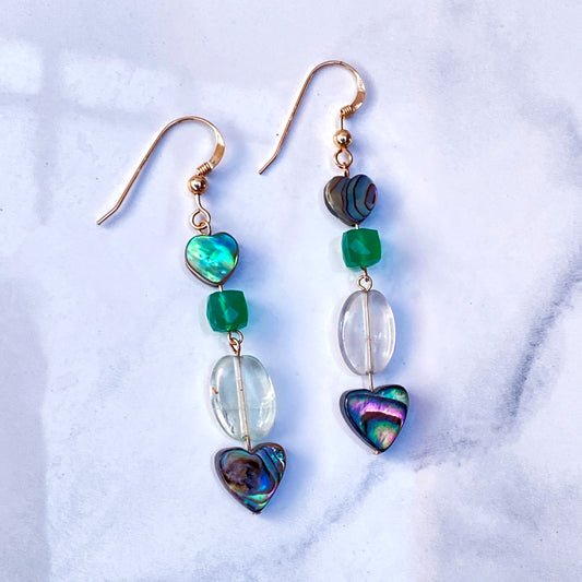 Abalone shell Heart, Green Onyx gemstone, and Green Amethyst drop earrings