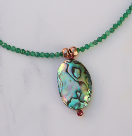 Abalone shell Pendant with Ruby gemstones on Green Onyx Necklace