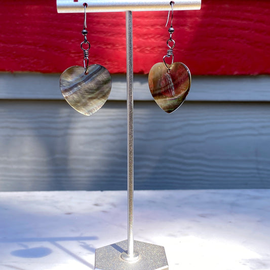Abalone Hearts, Black Spinel gemstones, and Oxidized Sterling Silver Drop Earrings