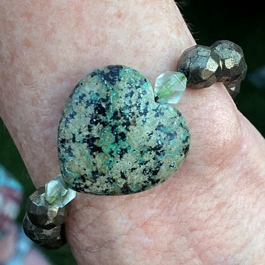 African Turquoise gemstone heart, Pyrite, and Green Topaz beaded bracelet