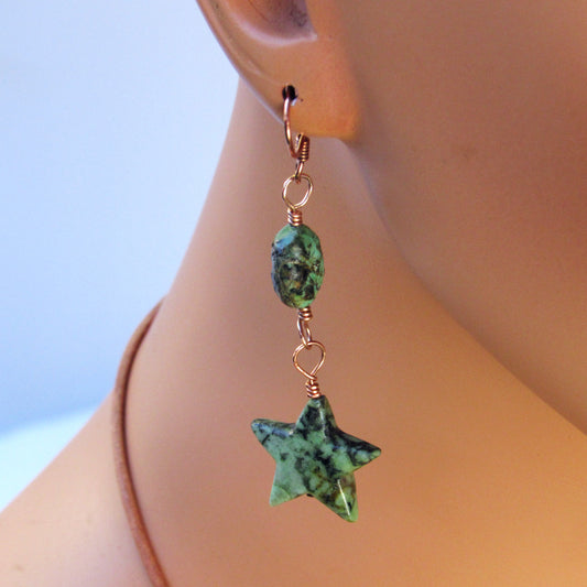 African Turquoise gemstone stars hand wrapped on Copper Drop Earrings