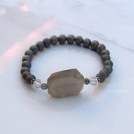 Silver Moonstone, Sterling Silver, Clear Quartz, and Silver Druzy Agates