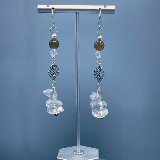 Clear Quartz Snake, Silver Moonstones, Sterling Silver Drop Earrings
