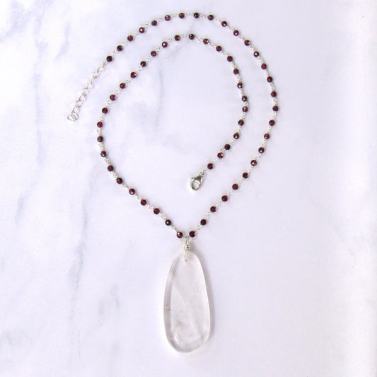 Clear Quartz Gemstone on Wrapped Garnets and Sterling Silver Necklace