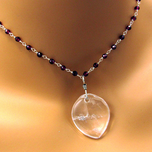 Clear Quartz Heart on Garnet Wrapped Sterling Silver Chain Necklace