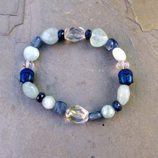 Blue Gemstone Buddha Stretch Bracelet with Sapphires and Quartz