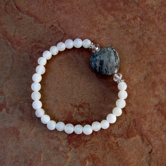 Frosted White Agate Gemstones, Chinese Crazy Lace Agate Heart, and Clear Quartz bracelet