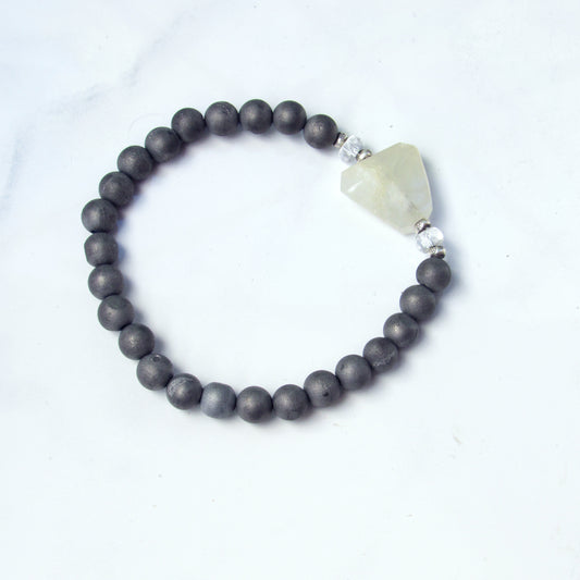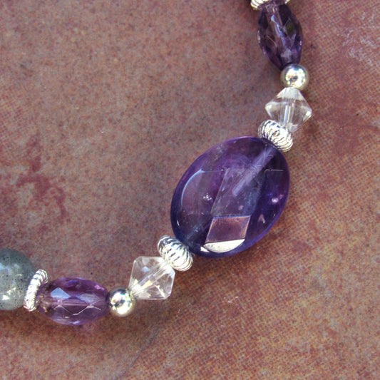 Amethyst Gemstones and Labradorite Heart, Clear Quartz, Stretch Bracelet w/ Sterling Silver