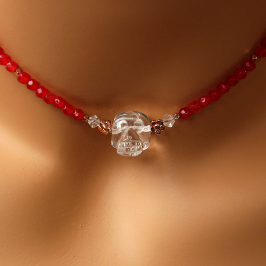 Red agate gemstones, Clear Quartz, 18 kt Rose gold vermeil over sterling silver flowers beaded choker
