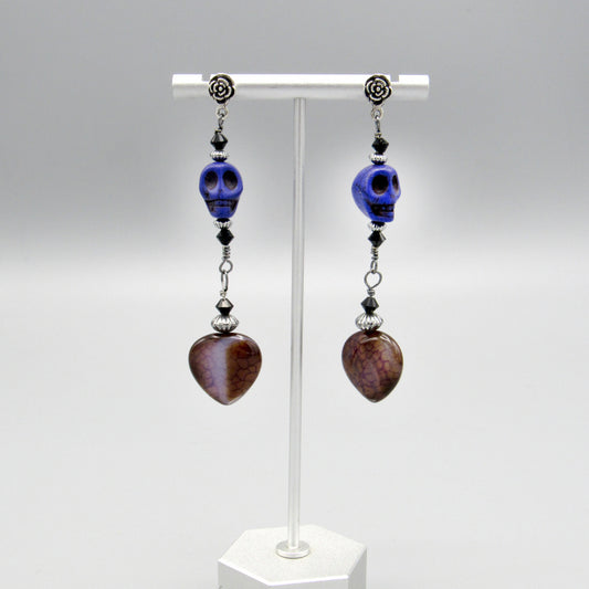 Purple Howlite Gemstone Skull with Onyx and Dragon’s Vein Agate Earrings
