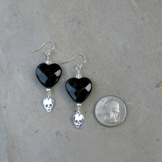 Faceted Onyx Heart, Moonstones, Sterling Silver Skulls, Drop Earrings