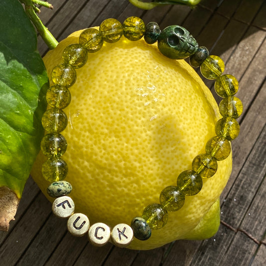 Men’s gray Agate, black Labradorite and hematite skull "Fuck" bracelet