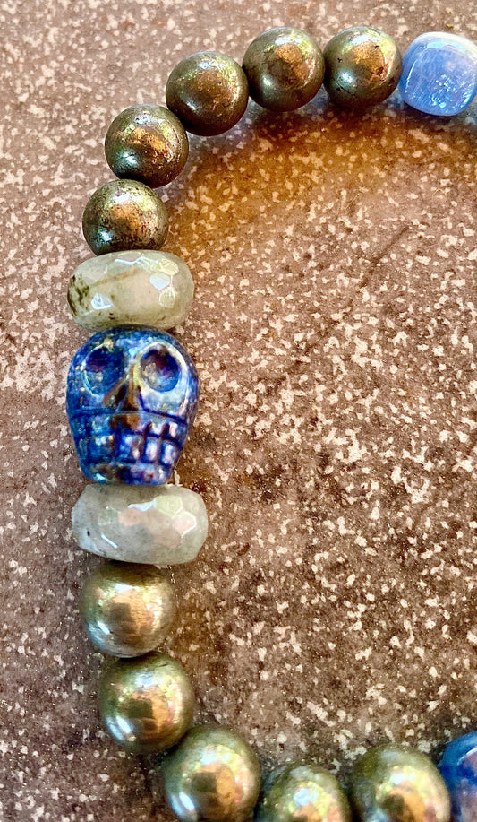 Men’s pyrite, labradorite, and lapis lazuli skull stretch bracelet