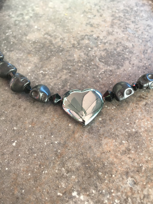 Black Skull & Crystal with Hematite gemstone heart Necklace
