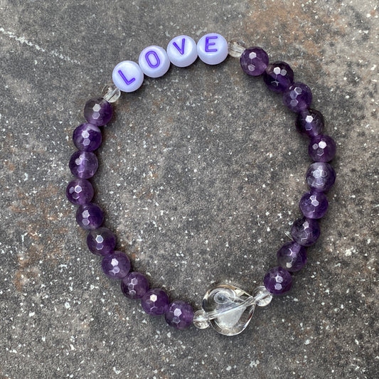 Women's Three Purple Gemstone "LOVE" bracelet stack made of white Jade, Amethyst, clear Quartz