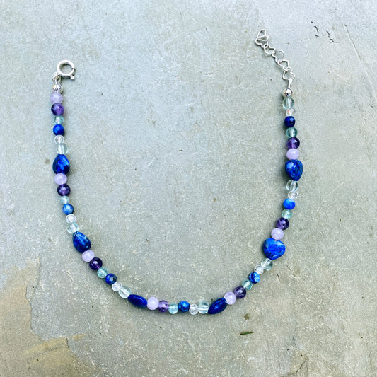 Beautiful Lapis Lazuli heart, clear quartz, fluorite, amethyst, sterling silver anklet