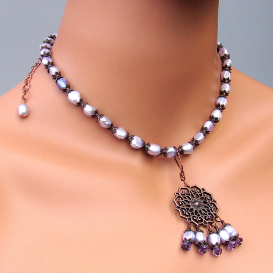 Purple freshwater pearls, amethyst gemstones, and copper chain and pendant design.