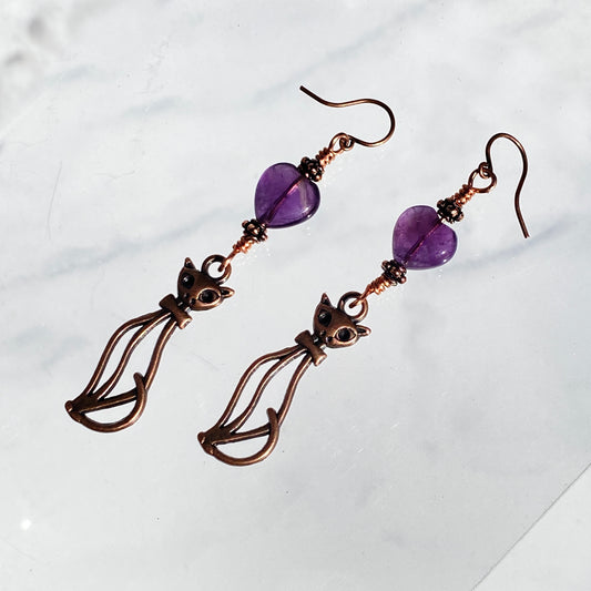 Amethyst gemstone Heart and Copper Kitty Drop Earrings