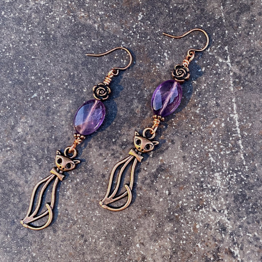 Amethyst gemstone and Copper Kitty Crystal Drop Earrings