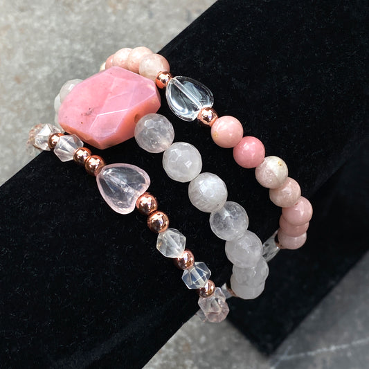 Women's KISS Gemstone bracelet stack set with Opals, Rose Quartz and Clear Quartz heart.