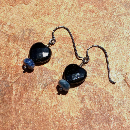 Tiny Faceted Onyx Gemstone Hearts and Precious Sapphire earrings