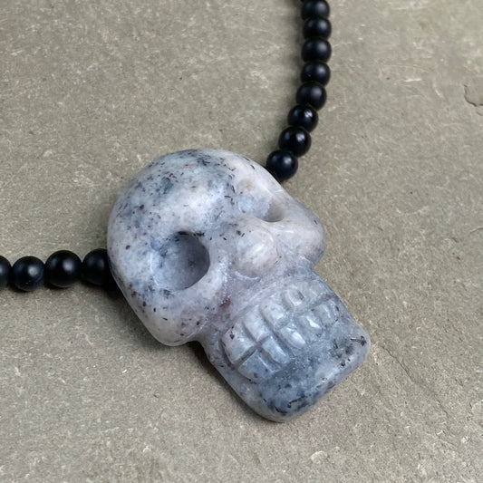 Ice Blue Agate skull w/ Onyx and Sterling Silver Clasp
