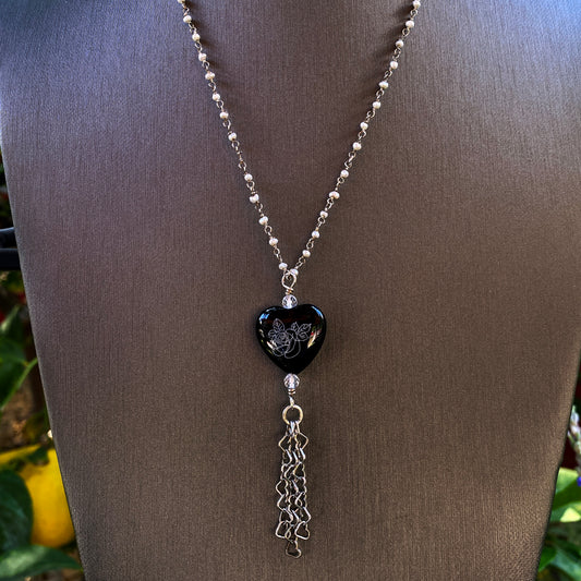 Sterling silver with freshwater pearls, painted onyx pendant, white topaz, hanging heart chain