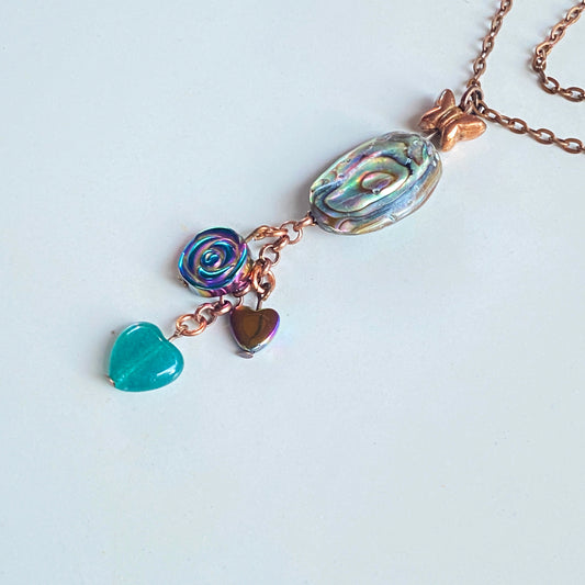Women's Copper Dream Necklace with Hematite, Abalone & Green Onyx Gemstone Heart