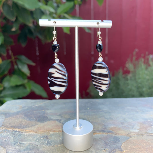 Mother of Pearl Zebra Print and Onyx, Moonstone Gemstone Earrings