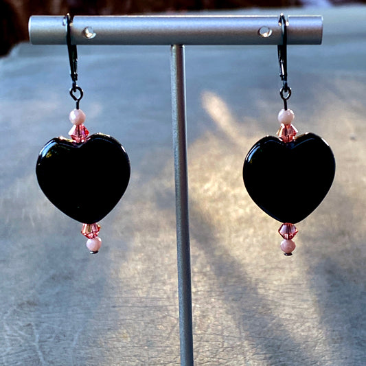 Large Black Onyx Hearts, Pink Swarovski Crystal & Pink opal drop Earrings