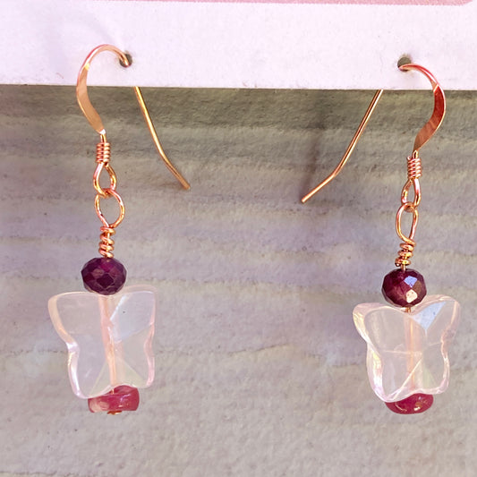 Precious ruby, Rose Quartz butterfly & Pink Tourmaline, 14 kt rose gold drop earrings.