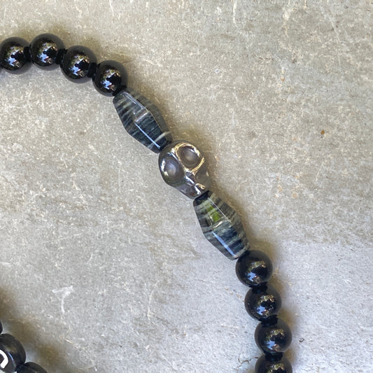 Men’s silver smoke jasper, onyx, and hematite skull "Curse" stretch bracelet