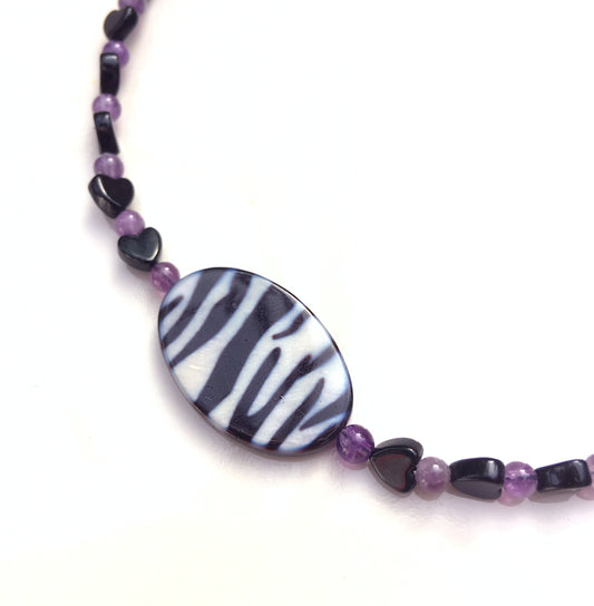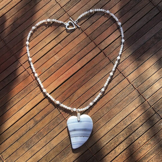 Striped Onyx heart pendant on beaded Moonstone & Clear Quartz Gemstone necklace