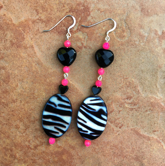 Women's Zebra print mother of pearl, pink Agate Gemstone and Onyx Heart Earrings