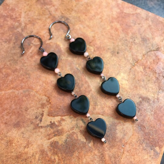 Onyx Hearts & Pink Opal long drop oxidized sterling silver earrings