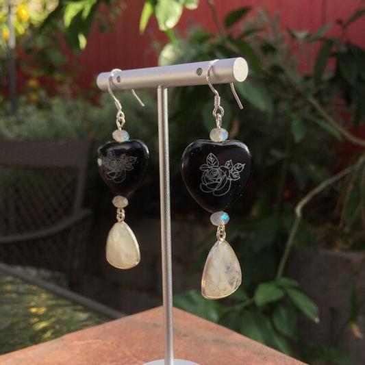 Painted Onyx Heart, Labradorite, Moonstone & sterling silver drop Earrings