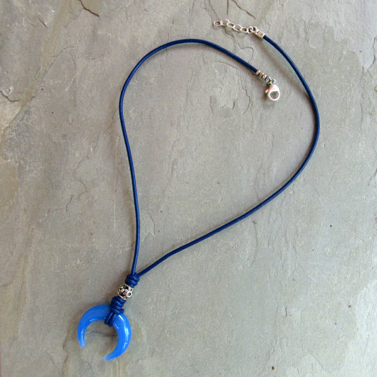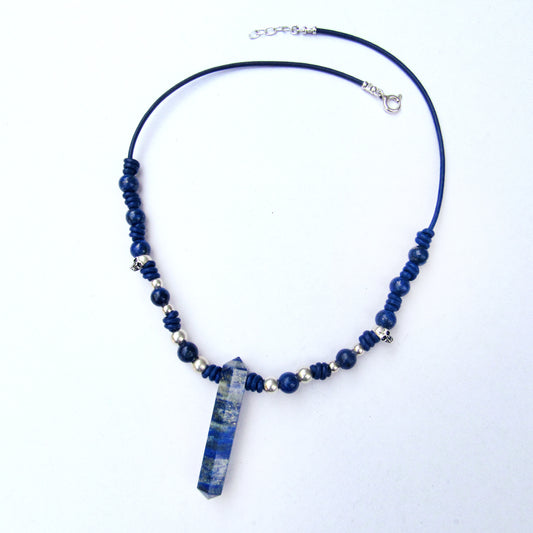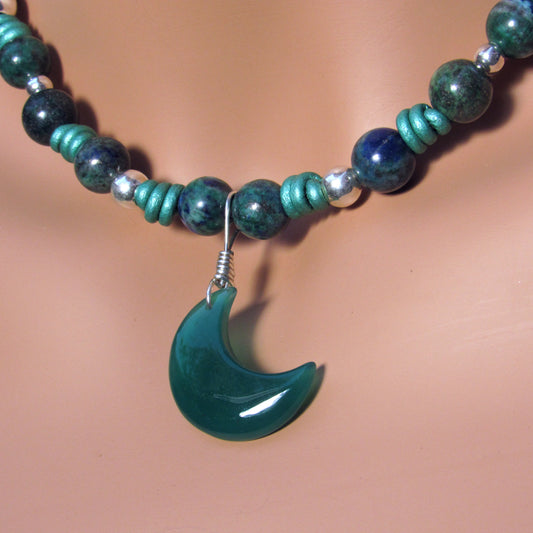 Green Onyx gemstone Moon, Lapis Lazuli Chrysocolla Intrusion, Sterling Silver, on Leather Necklace