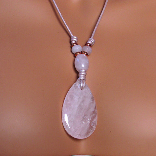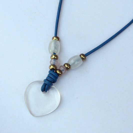 Clear Quartz & Rose Quartz gemstones with Brass on Blue Leather Necklace