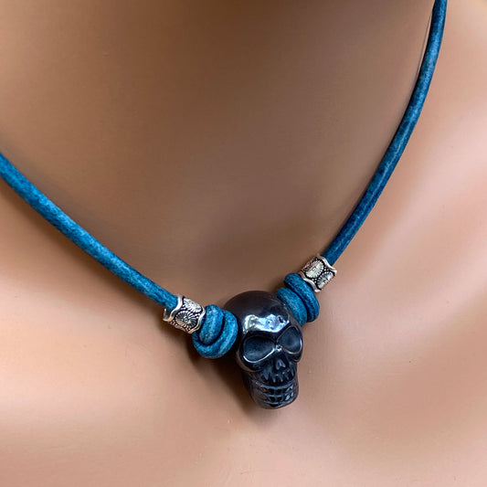 Hematite gemstone Skull and Sterling Silver on Leather Necklace
