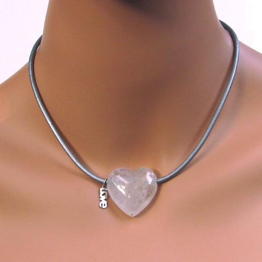 Clear Quartz gemstone with Sterling Silver Love on Metallic Leather Necklace