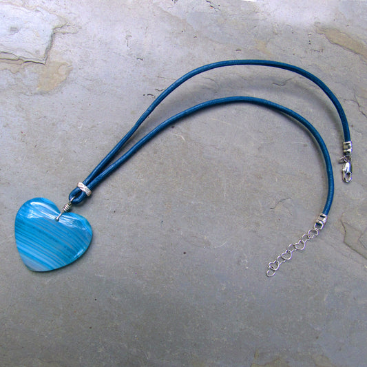 Blue Onyx Agate Gemstone on Leather with Sterling Silver Accents, Clasp and Chain
