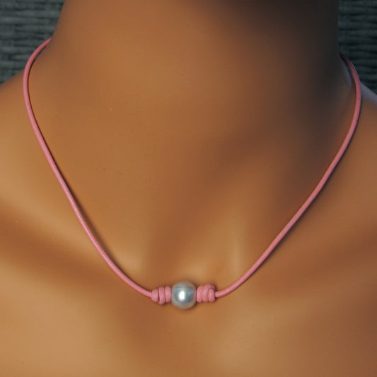 Freshwater Pearl Choker on Pink Leather with Sterling Silver Clasp