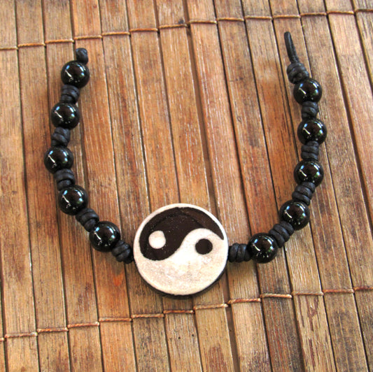 Black Agate and Agate Gemstone Yin Yang Leather Bracelet