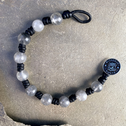 Leather and Cloudy Quartz Gemstone Men’s Bracelet with Metal Route 66 Button