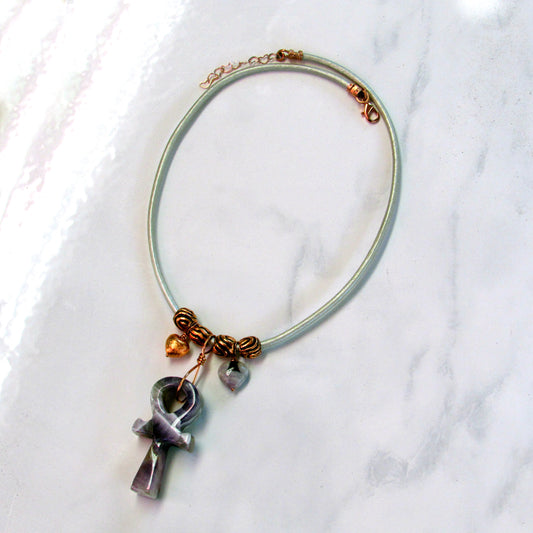 Amethyst gemstone carved Ankh pendant with copper on leather necklace