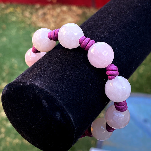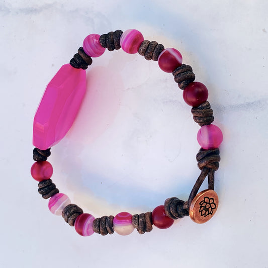 Leather and Pink Agate Hand Knotted Bracelet