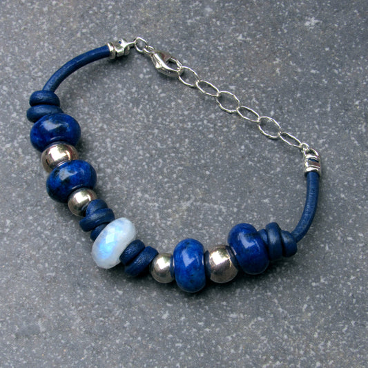 Moonstone center stone with Lapis Lazuli gemstones, and Sterling Silver leather bracelet
