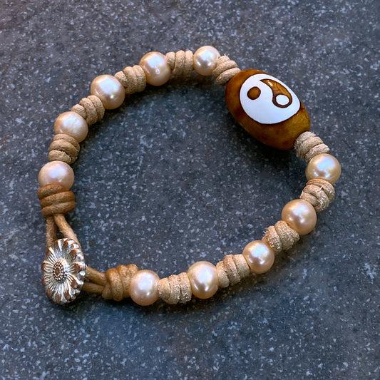 Women’s Genuine Freshwater Pearl and Tibetan Agate Gemstone Yin Yang leather bracelet